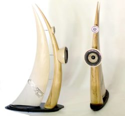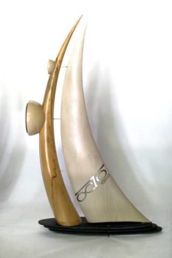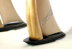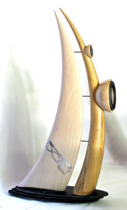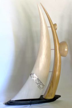 « Les voiles » sont fabriquées en bois de Fraké pour les mâts et avec du bois de Châtaignier pour les voilures. Les socles de forme ellipsoïdale sont réalisés en acier avec une découpe Laser.
