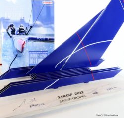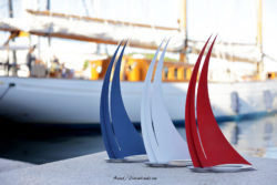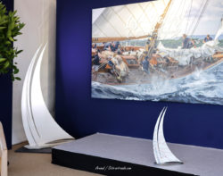 “The sails” are made in Fraké wood for the masts and Chestnut wood for the sails. The ellipsoidal shaped are made in steel with a laser cut.